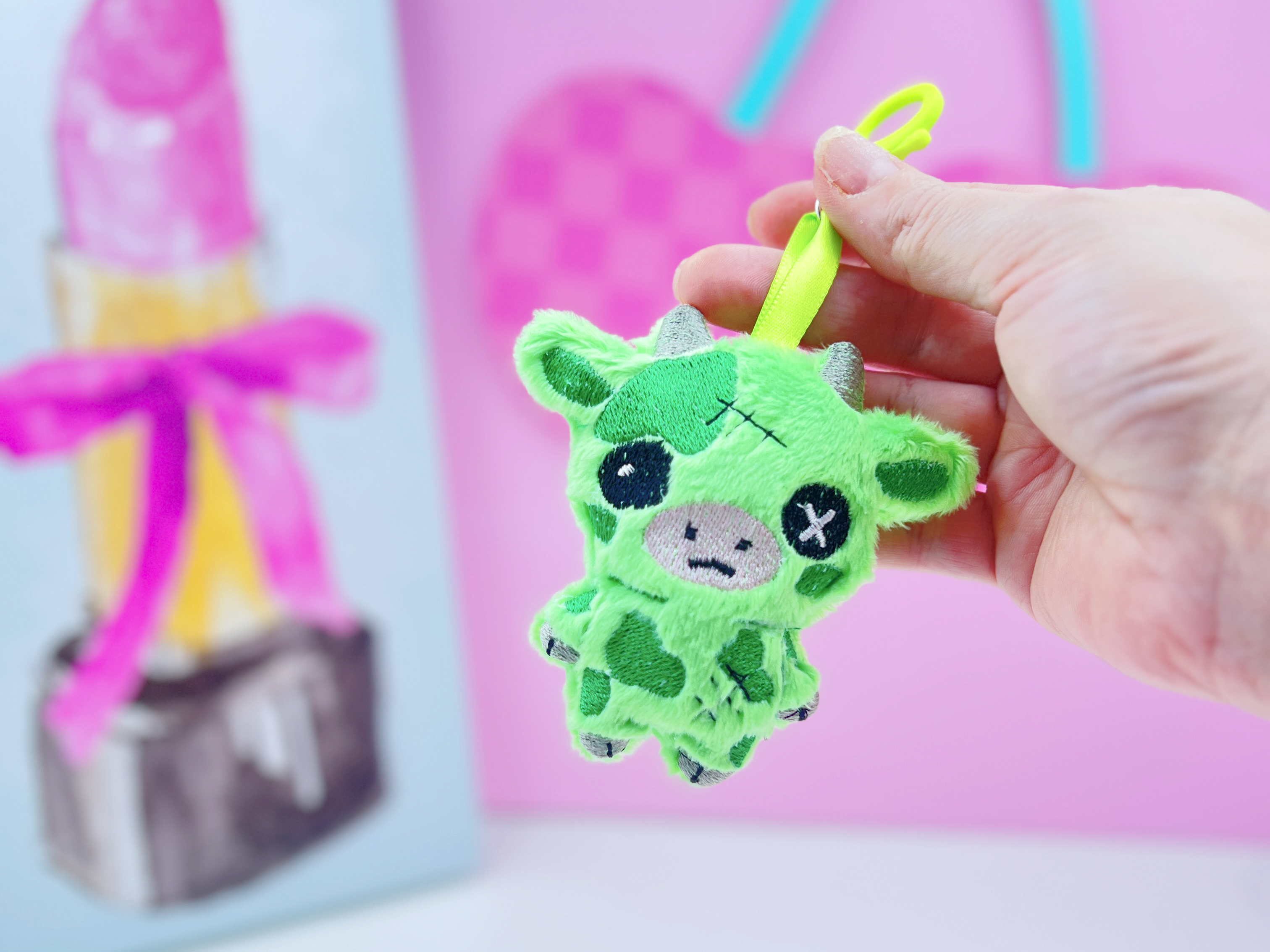 Add some undead farmyard fun to your bag or keys with this Zombie Cow Plush Bag Charm! Handmade from bright lime green minky fabric, this spooky cute cow features embroidered details like darker green spots, grey hooves and horns, black stitches, and a kawaii zombie face that’s equal parts creepy and cute.