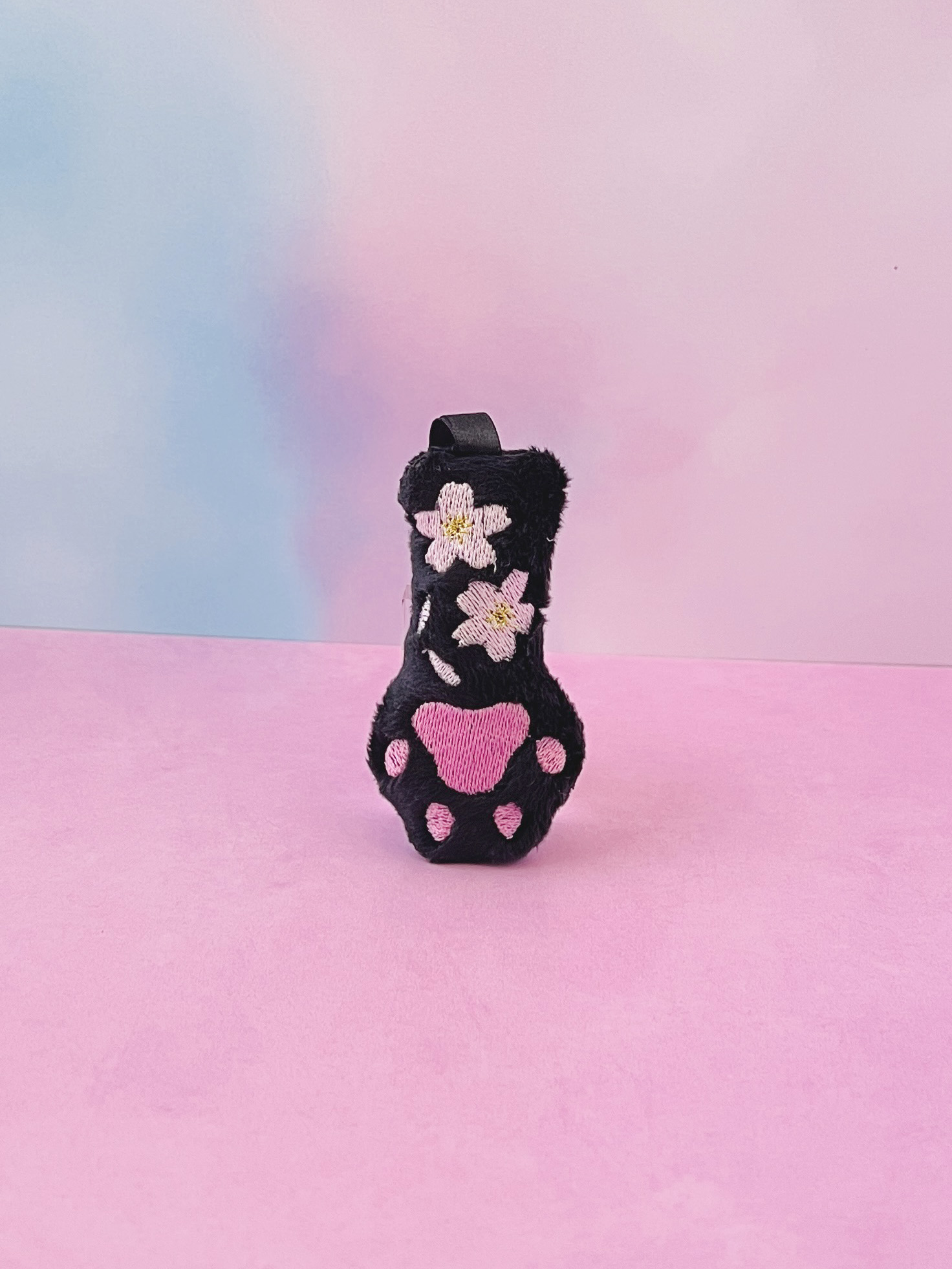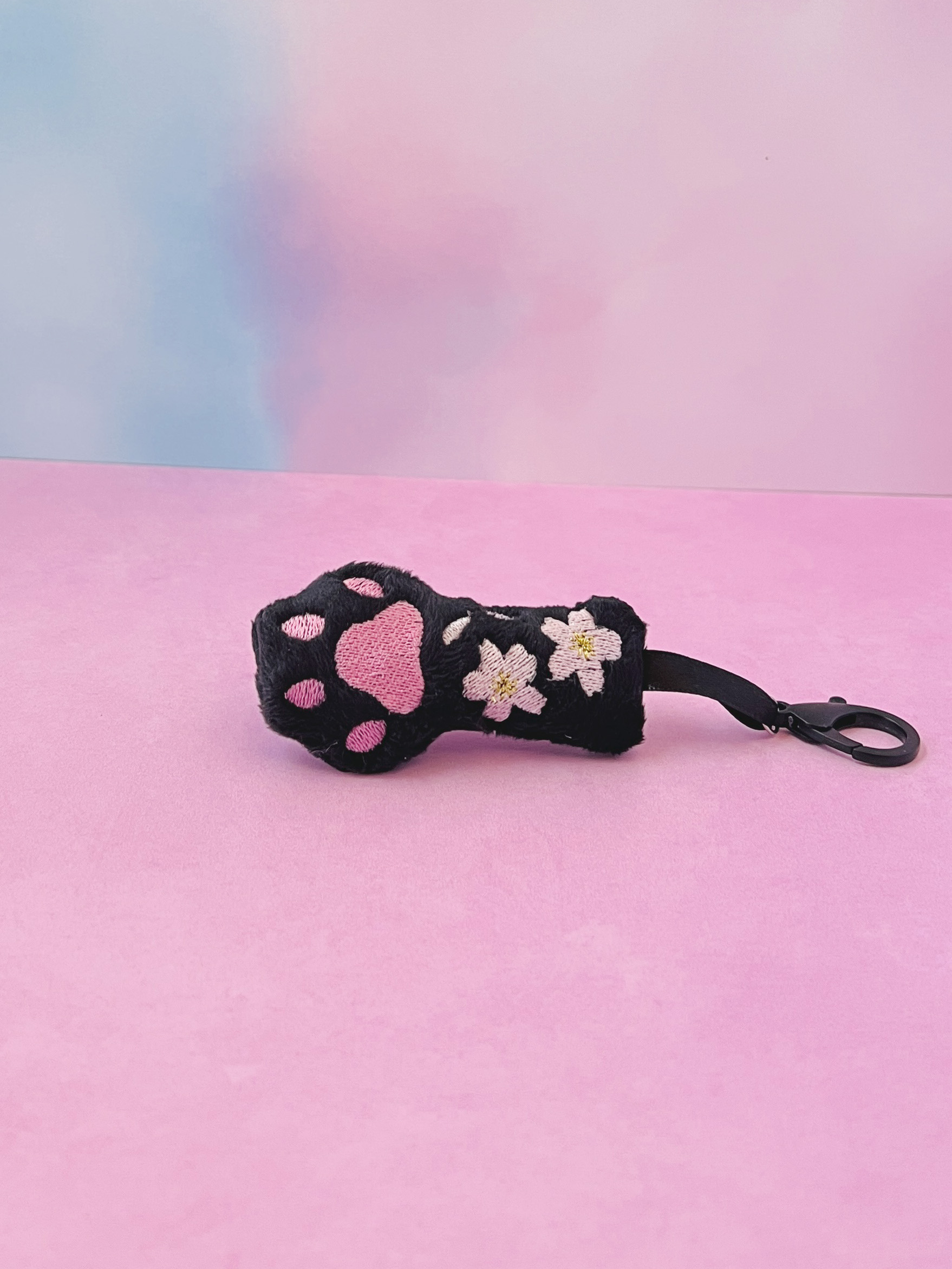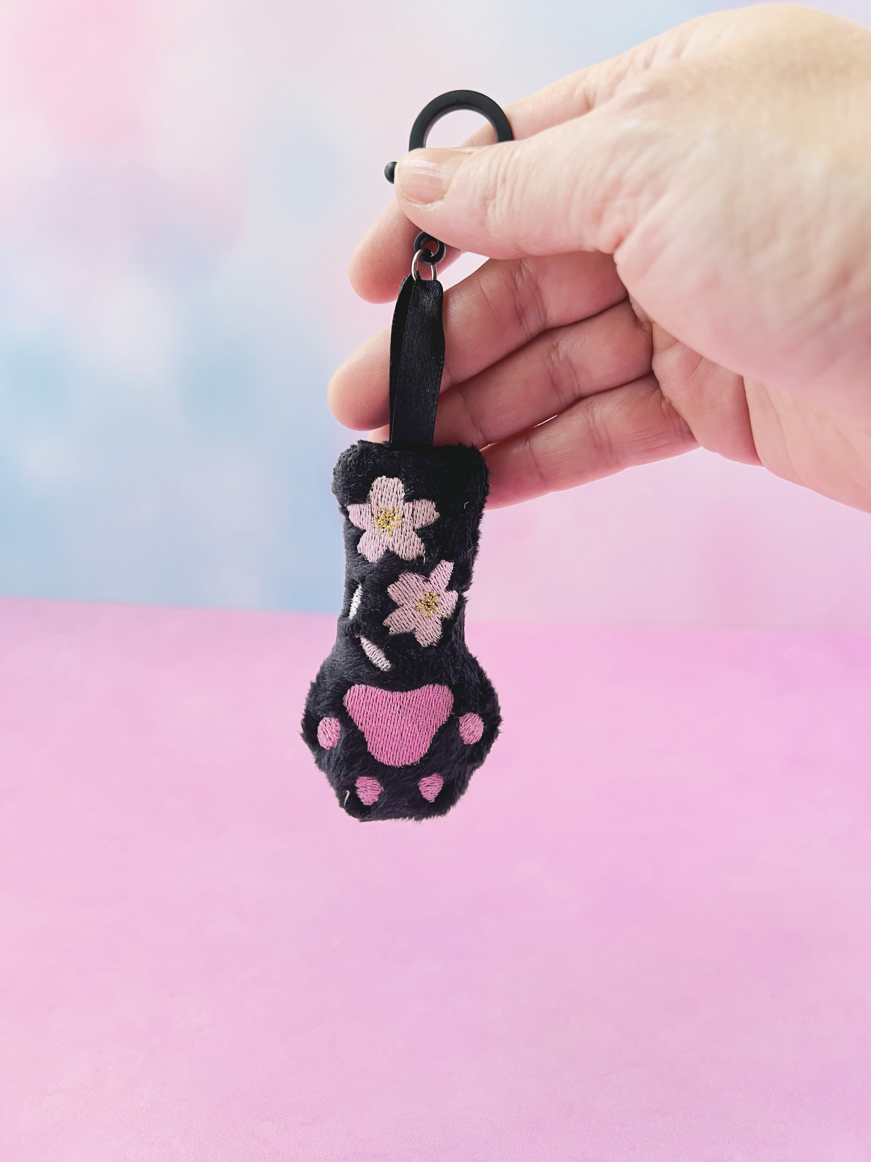 This is a brand-new version of my bestselling Cat Paw Plush Bag Charm, now with a soft sakura twist! Made from plush black minky fabric, this creepy cute paw features sweet pink embroidered toe beans and delicate pink sakura cherry blossom details for the perfect blend of spooky and soft.
