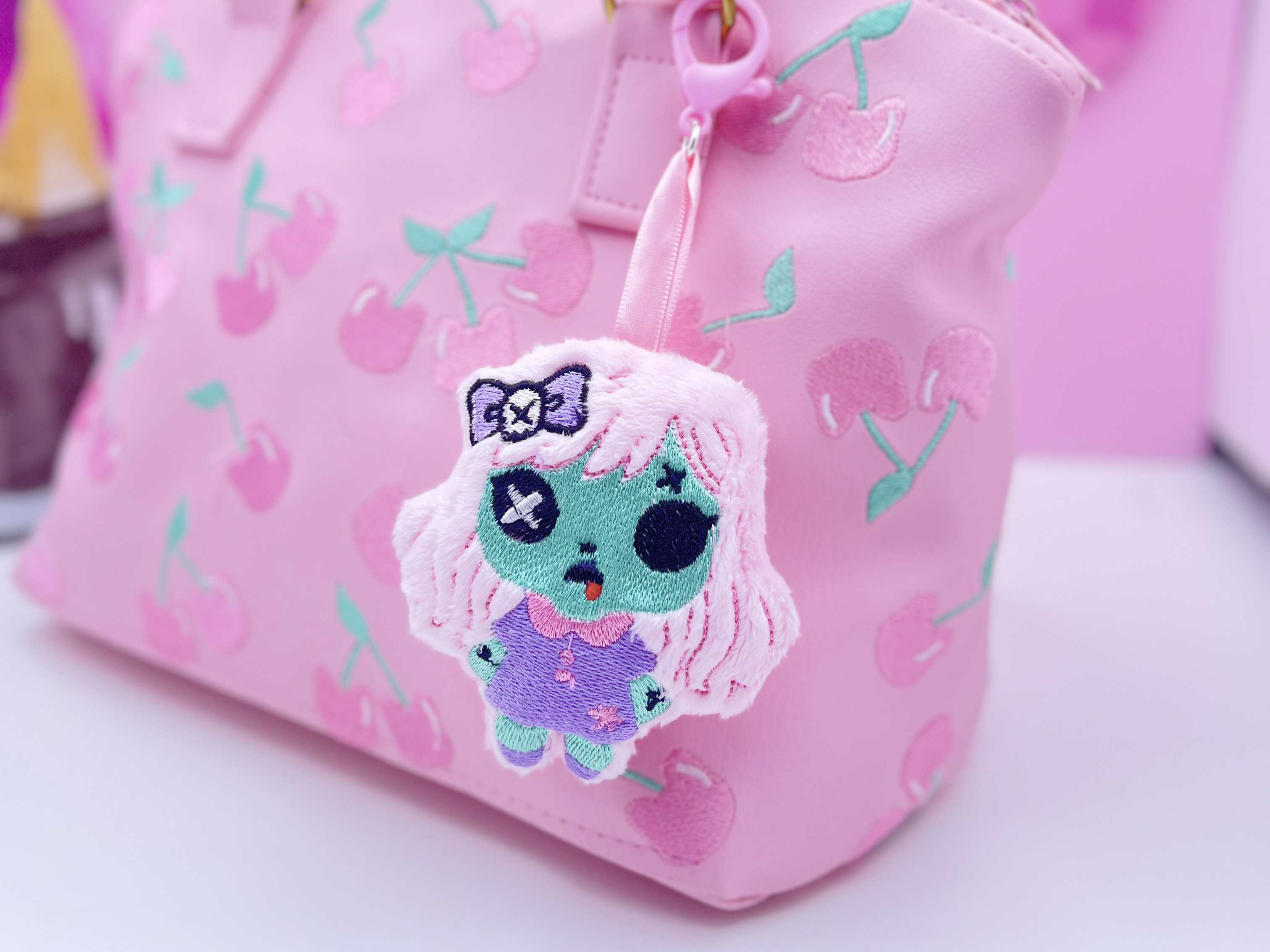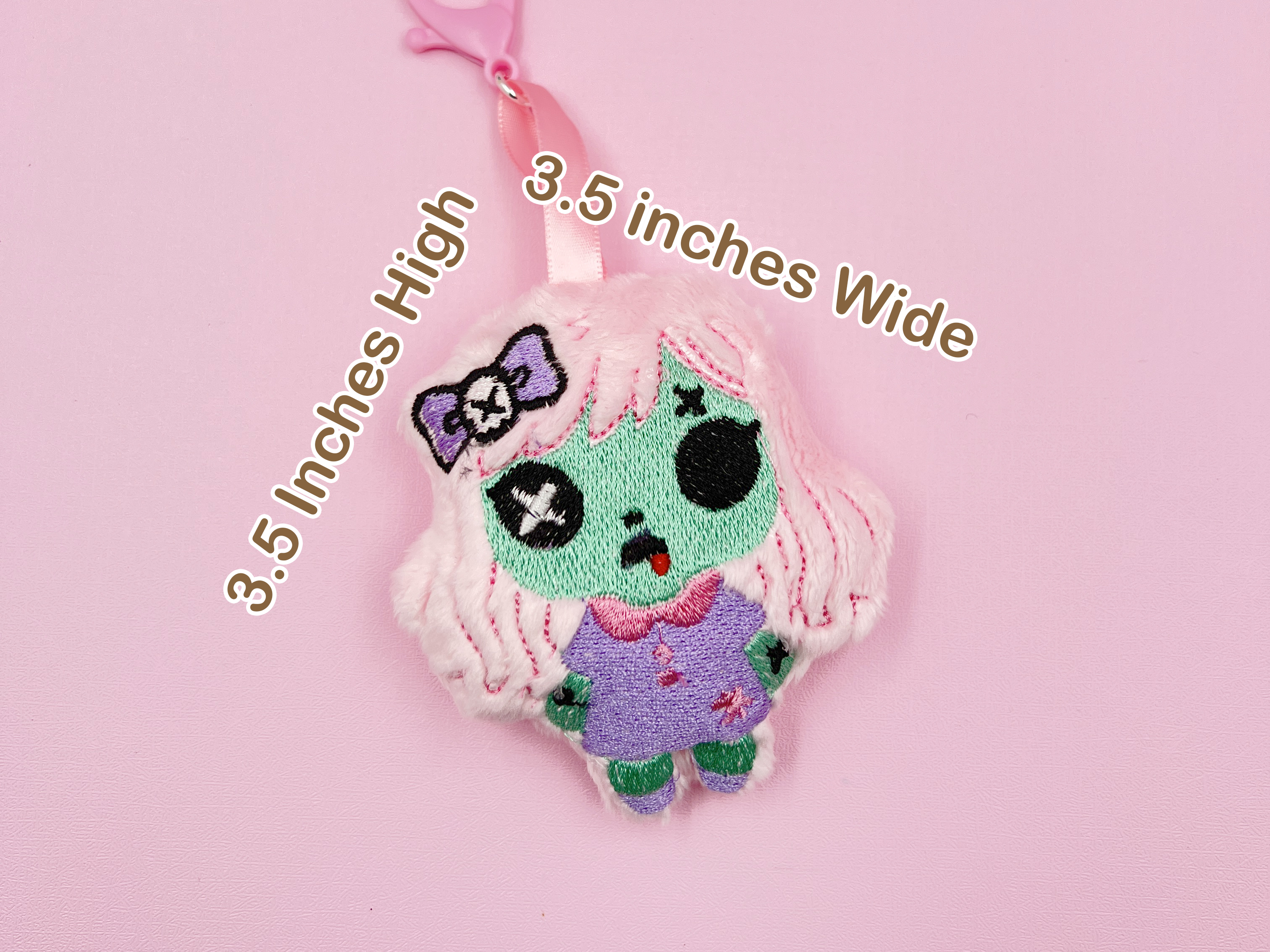 Add some hauntingly adorable flair to your bag or keys with this Dead Doll Plush Bag Charm! Handmade from soft pastel pink minky fabric, this creepy cute doll features embroidered details like green zombie-style skin, a kawaii undead face, a sweet lavender dress, and a matching spooky lavender bow stitched between her pink hair. Finished with a sturdy pink plastic clasp, this charm is perfect for attaching to your backpack, purse, tote, or keys.