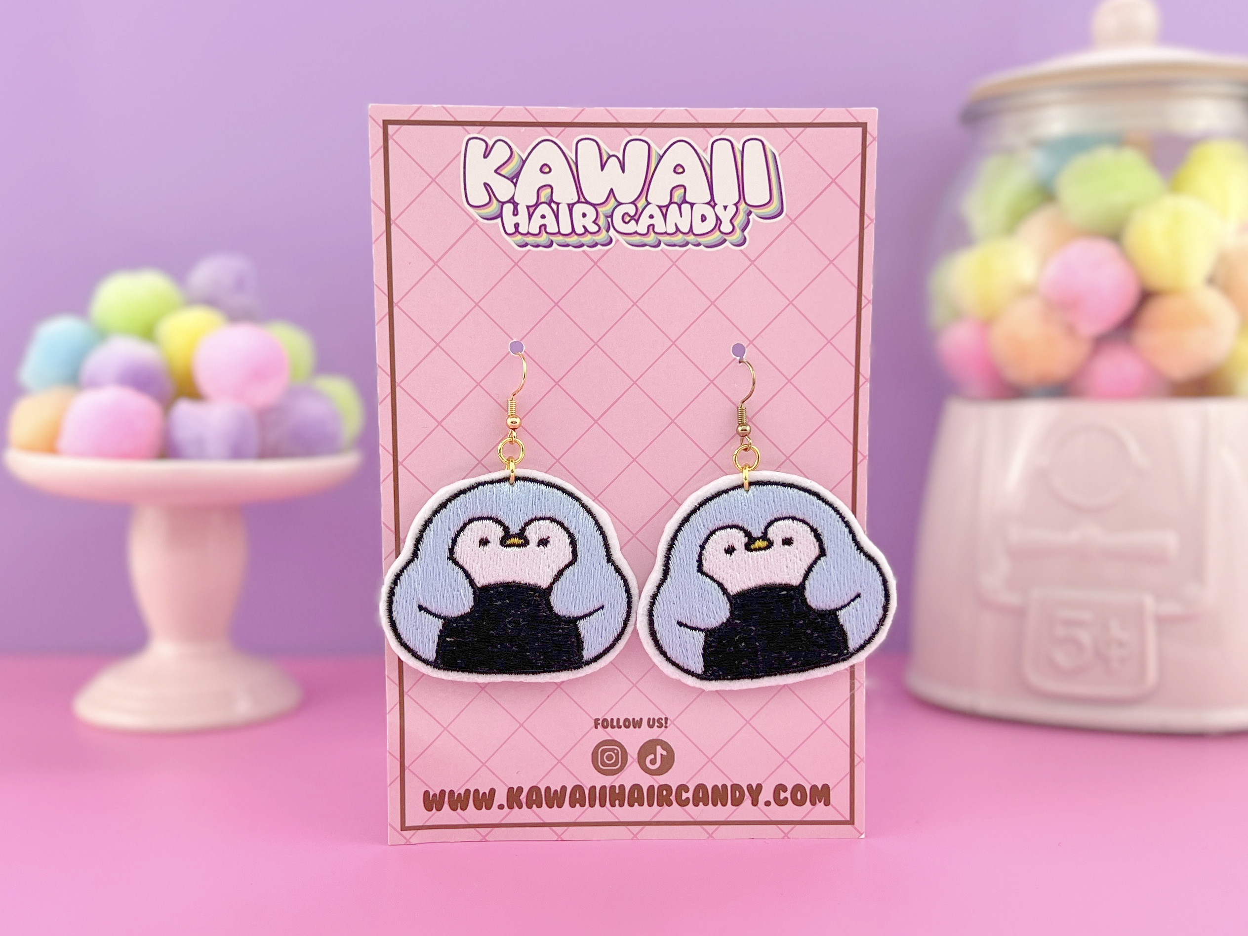 These cute kawaii penguin onigiri earrings are an adorable and unique addition to your jewelry collection. Each earring features a super cute light blue penguin designed to resemble a Japanese onigiri rice ball, bringing a playful and charming touch to any outfit. Made from high-quality fabrics and detailed machine embroidery, these earrings showcase exceptional craftsmanship and creativity.