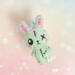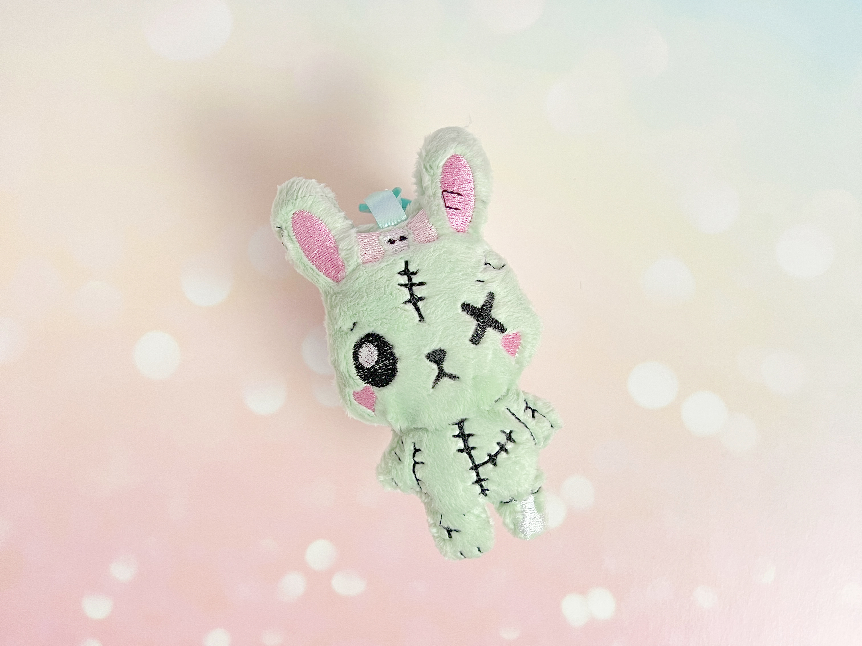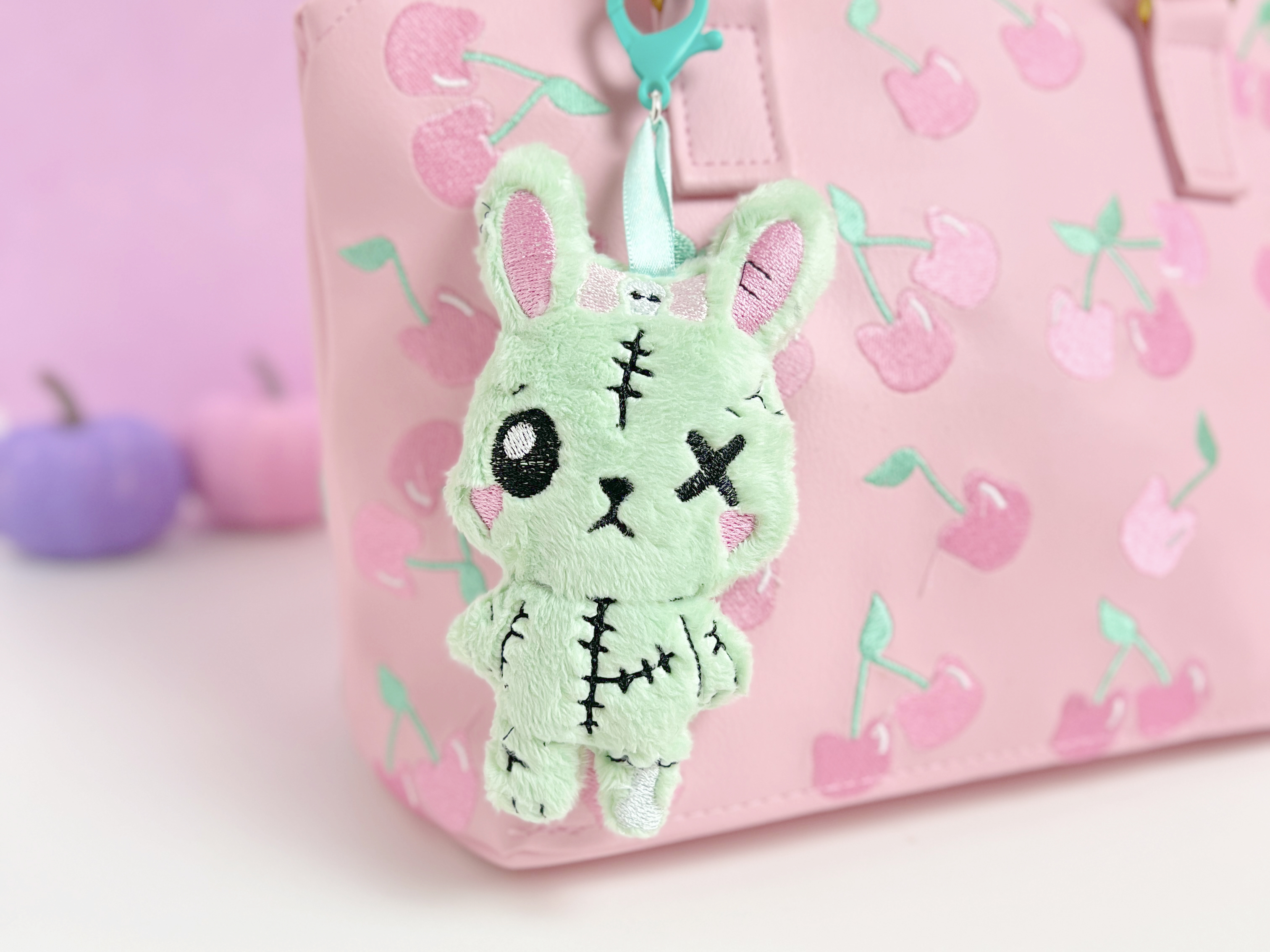 Meet your new creepy cute companion! This Dead Bunny Plush Bag Charm is made from ultra-soft mint minky and handcrafted with love in my USA studio. Designed in a full-body style, this chibi bunny features spooky embroidered details including a stitched kawaii face, zombie-style accents, and a tiny embroidered skull bow nestled between its ears for an extra touch of macabre sweetness.
