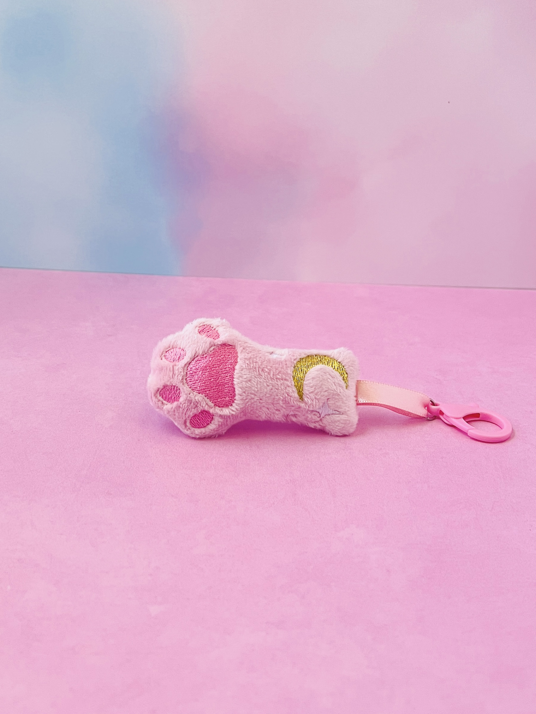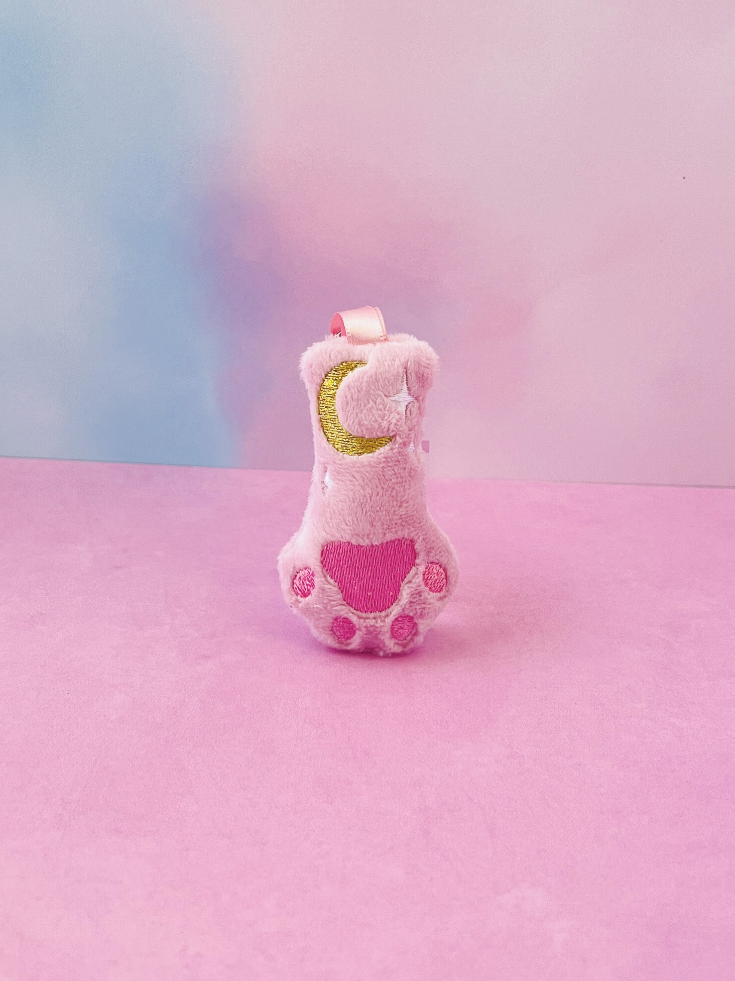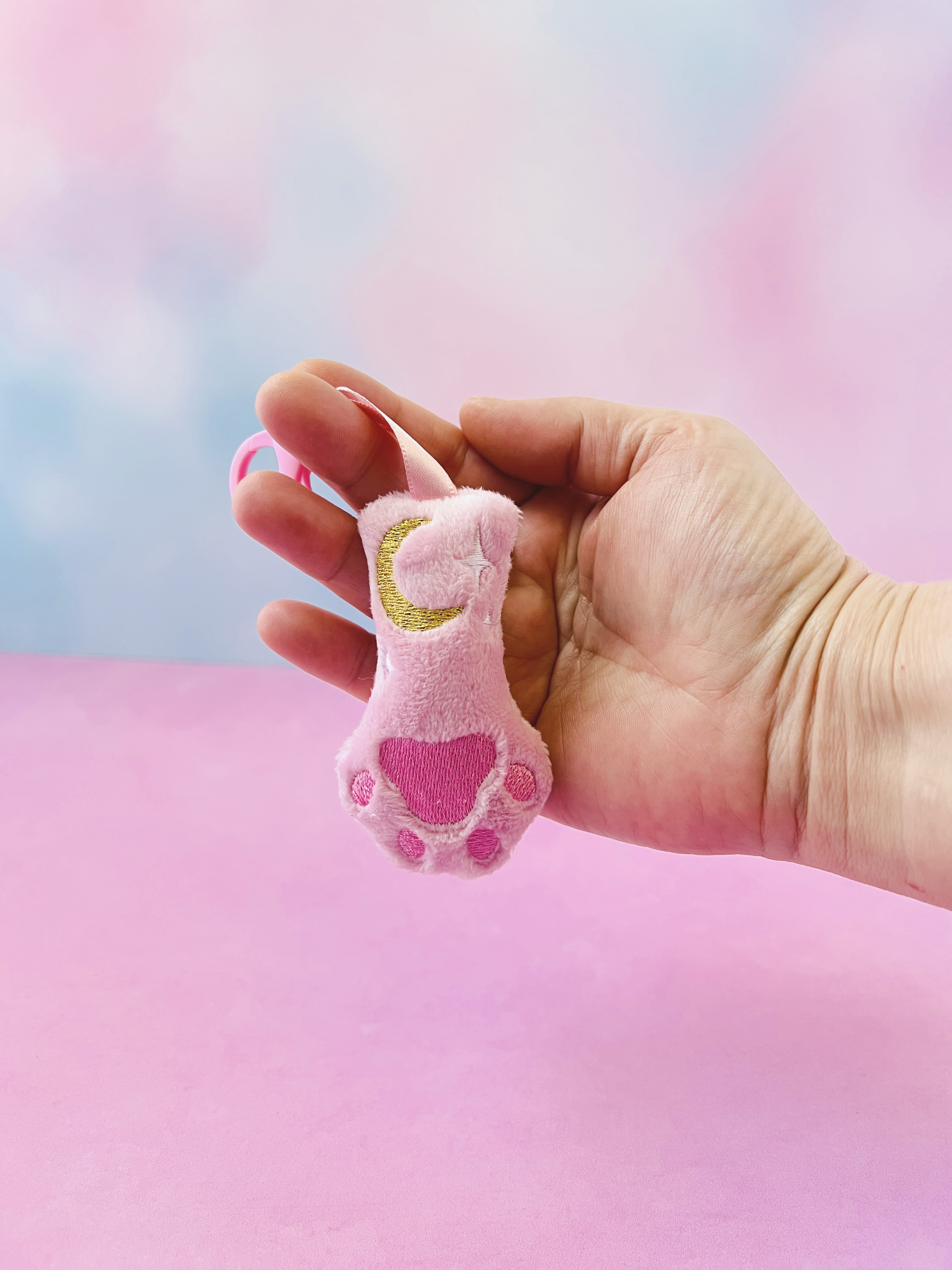 Pink Celestial Cat Paw Plush Bag Charm, Kawaii Cat Paw Keychain Crescent Moon Stars, Cute Plush Keyring, Pastel Goth Astrology Accessory