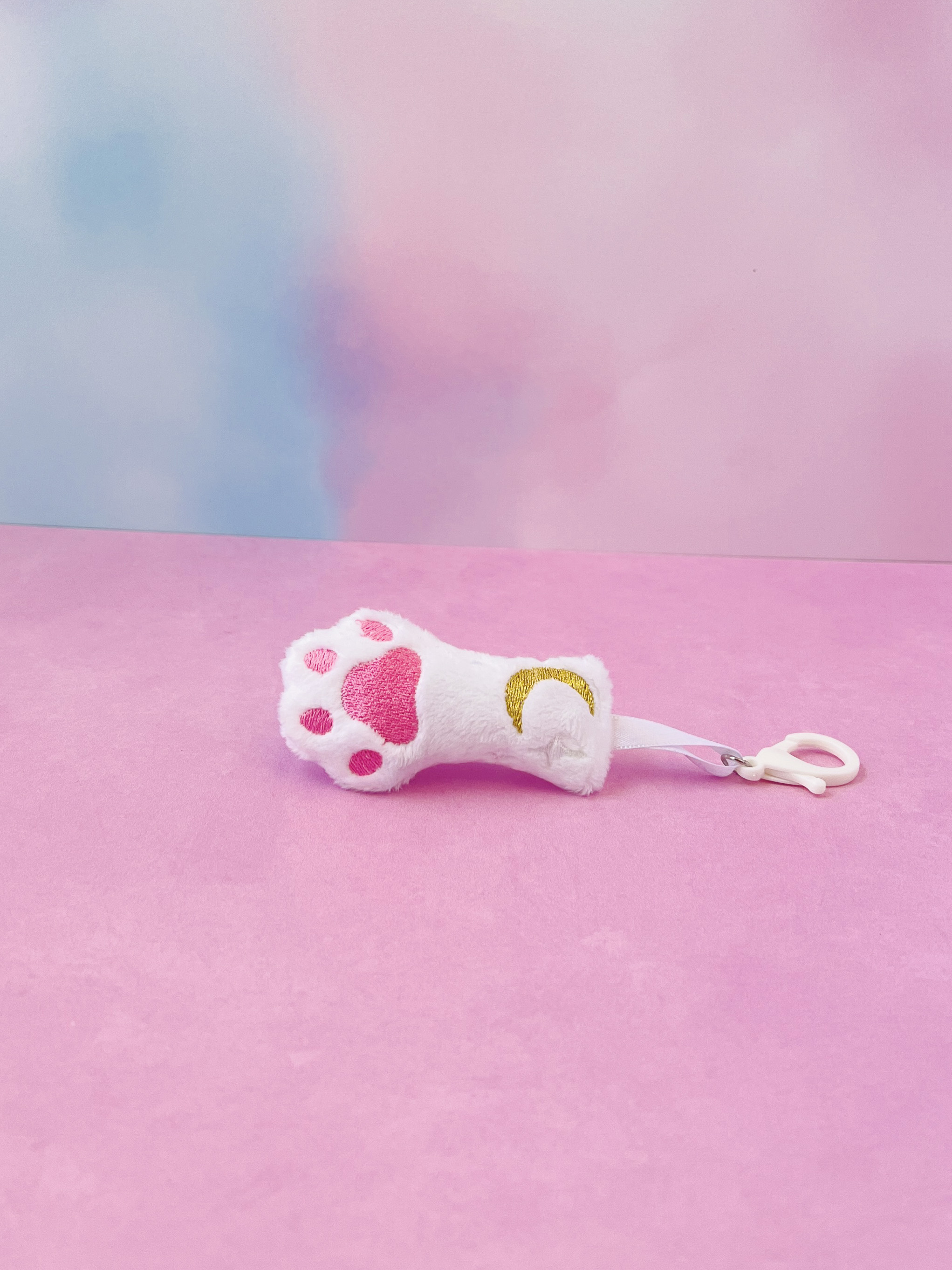 White Celestial Cat Paw Plush Bag Charm, Kawaii Cat Paw Keychain Crescent Moon Stars, Cute Plush Keyring, Pastel Goth Astrology Accessory