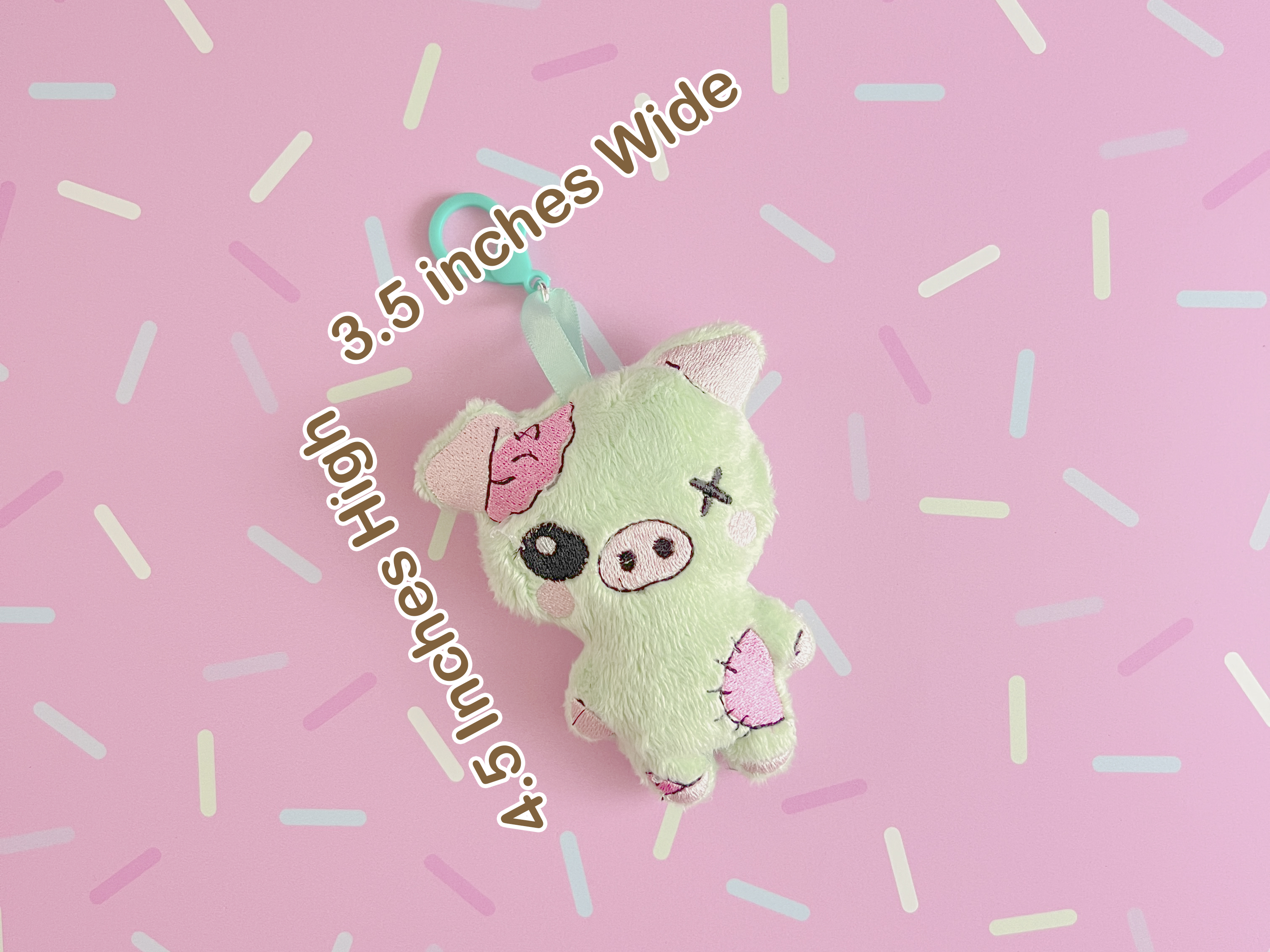Oink your way into spooky style with this adorably undead Zombie Pig Plush Bag Charm! Handmade from soft pastel mint minky fabric, this creepy cute piggy features embroidered zombie details including pink exposed brains, black stitches, and a sweet kawaii undead face. The charm is finished with a sturdy plastic clasp, perfect for clipping to your purse, backpack, tote bag, or keys.