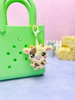 Bring a dose of pastel cuteness everywhere you go with this Chocolate Milk Cow Plush Bag Charm! Handmade from soft tan minky fabric, this chibi cow features embroidered details like brown spots, a kawaii face, and sweet accents that make it extra adorable. Complete with a sturdy plastic clasp, this plush charm easily clips to your backpack, purse, tote, or keys, making it a fun accessory for any kawaii fan.