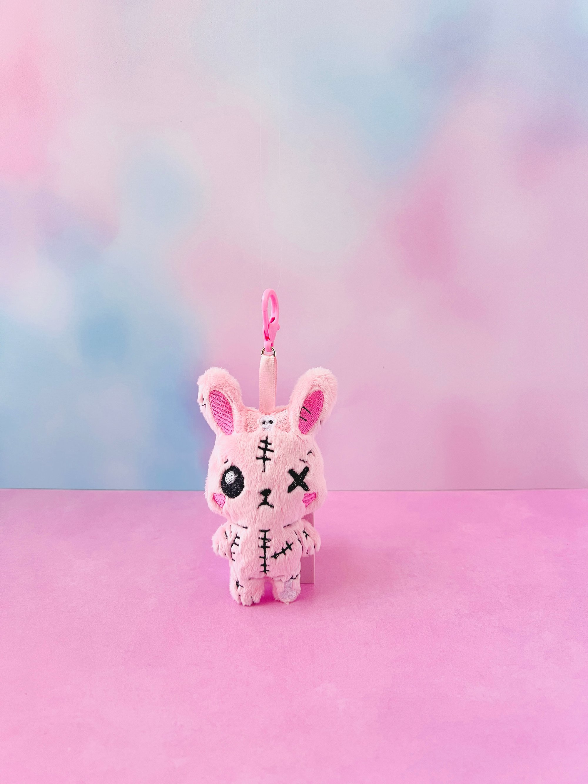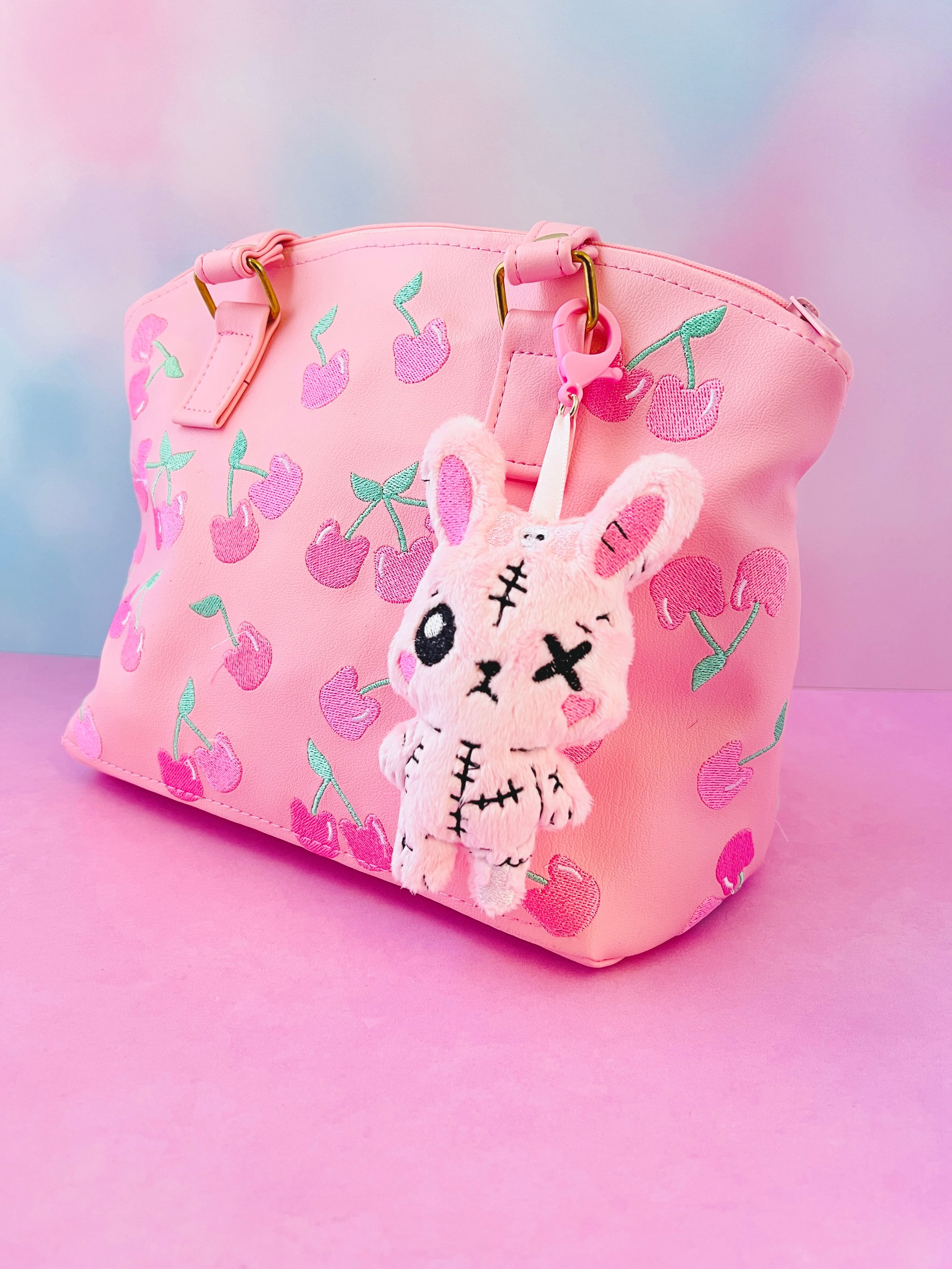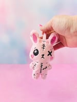 Meet your new creepy cute companion! This Dead Bunny Plush Bag Charm is made from ultra-soft pink minky and handcrafted with love in my USA studio. Designed in a full-body style, this chibi bunny features spooky embroidered details including a stitched kawaii face, zombie-style accents, and a tiny embroidered skull bow nestled between its ears for an extra touch of macabre sweetness.