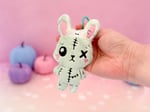Meet your new creepy cute companion! This Dead Bunny Plush Bag Charm is made from ultra-soft mint minky and handcrafted with love in my USA studio. Designed in a full-body style, this chibi bunny features spooky embroidered details including a stitched kawaii face, zombie-style accents, and a tiny embroidered skull bow nestled between its ears for an extra touch of macabre sweetness.