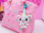 Bring a dose of pastel cuteness everywhere you go with this Mint Cow Plush Bag Charm! Handmade from soft pastel mint minky fabric, this chibi cow features embroidered details like pink spots, a kawaii face, and sweet accents that make it extra adorable. Complete with a sturdy plastic clasp, this plush charm easily clips to your backpack, purse, tote, or keys, making it a fun accessory for any kawaii fan.